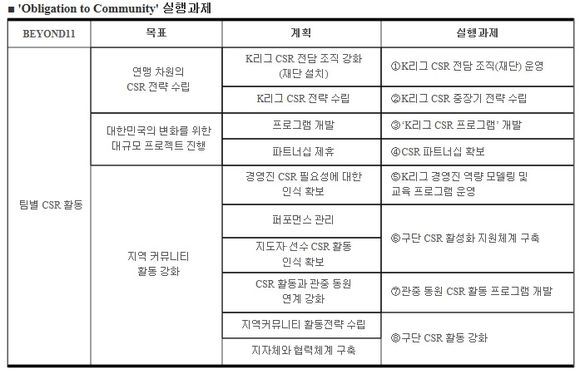 이를 위해 ▲프로축구연맹 차원의 CSR 전략 수립 ▲대한민국의 변화를 위한 대규모 프로젝트 진행 ▲지역 커뮤니티 활동 강화를 내용으로 하는 총 8개의 실행과제를 도출했다.