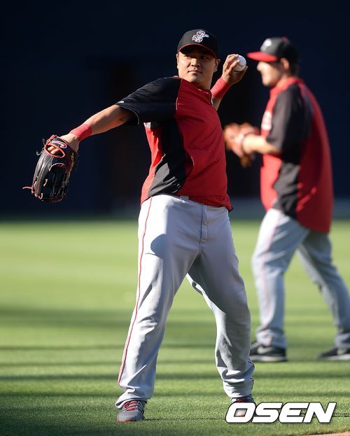 31일(이하 한국시간) 미국 캘리포니아주 샌디에이고 펫코파크에서 열린 2013 메이저리그 샌디에이고 파드리스와 신시내티 레즈의 경기, 경기에 앞서 신시내티 추신수가 훈련을 하고 있다.
