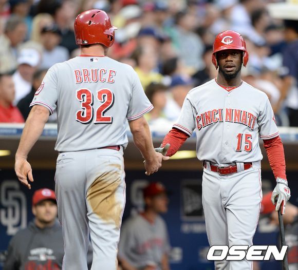 31일(이하 한국시간) 미국 캘리포니아주 샌디에이고 펫코파크에서 열린 2013 메이저리그 샌디에이고 파드리스와 신시내티 레즈의 경기, 2회초 1사 1,3루에서 신시내티 메소라코의 내야땅볼 때 홈을 밟은 3루주자 브루스가 덕아웃에서 로빈슨과 하이파이브를 하고 있다.
