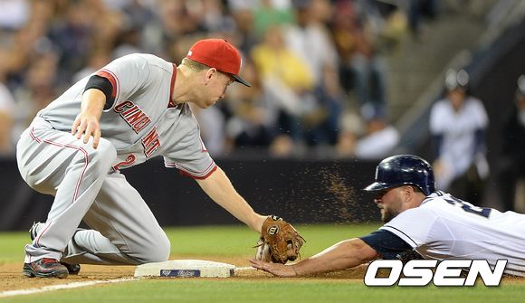 31일(이하 한국시간) 미국 캘리포니아주 샌디에이고 펫코파크에서 열린 2013 메이저리그 샌디에이고 파드리스와 신시내티 레즈의 경기, 4회말 무사 2루에서 샌디에이고 기오코 타석 때 2루주자 알론소가 도루에 실패 하고 있다.