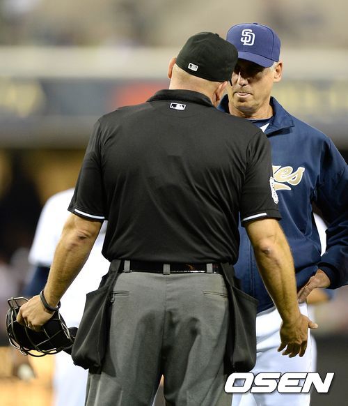 31일(이하 한국시간) 미국 캘리포니아주 샌디에이고 펫코파크에서 열린 2013 메이저리그 샌디에이고 파드리스와 신시내티 레즈의 경기, 5회초 1사 1루에서 신시내티 브루스의 희생번트 때 1루주자 코자트가 2루에서 세이프 되자 샌디에이고 버드 블랙 감독이 심판진에 항의하고 있다.