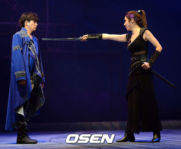 31일 오후 홍익대 대학로아트센터 대극장에서 열린 뮤지컬 '미스터 온조' 프레스콜에서 '온조'홍경민과 '금비라' 전수미가 멋진 무대를 선보이고 있다.