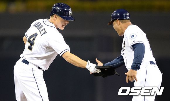 31일(이하 한국시간) 미국 캘리포니아주 샌디에이고 펫코파크에서 열린 2013 메이저리그 샌디에이고 파드리스와 신시내티 레즈의 경기, 8회말 2사 1,2루에서 샌디에이고 헌들리가 좌전 2타점 적시 2루타를 치고 환호하고 있다.