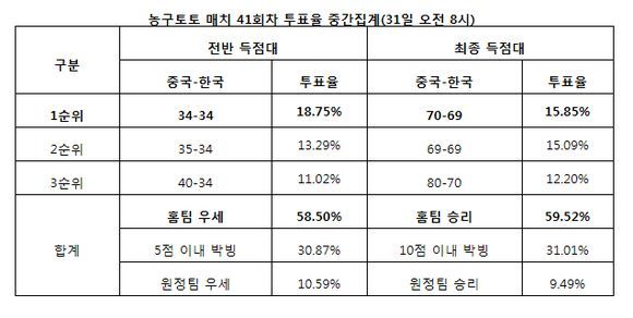최종득점대 70-69점대 중국 우세 전망 15.85% 최다…1일 오후 6시 35분 발매 마감