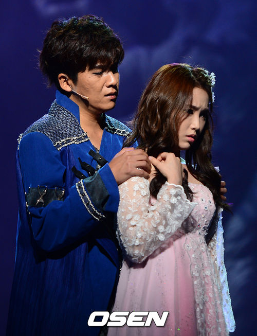 31일 오후 홍익대 대학로아트센터 대극장에서 열린 뮤지컬 '미스터 온조' 프레스콜에서 홍경민과 박세미가 멋진 무대를 선보이고 있다.