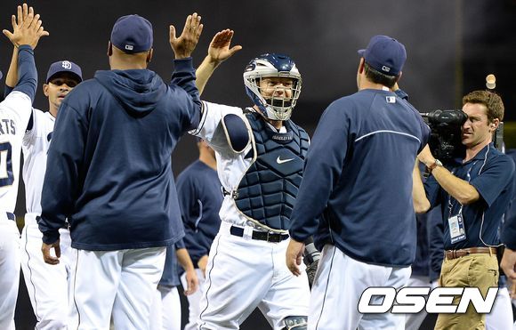 경기 종료 후 샌디에이고 헌들리가 동료들과 승리의 기쁨을 나누고 있다. /sunday@osen.co.kr