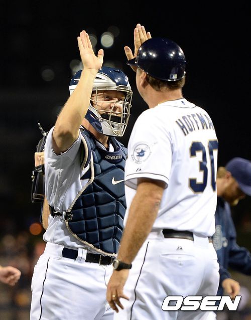 경기 종료 후 샌디에이고 헌들리가 동료들과 승리의 기쁨을 나누고 있다. /sunday@osen.co.kr