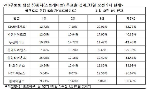 국민체육진흥공단(www.kspo.or.kr)이 발행하는 체육진흥투표권 수탁사업자인 스포츠토토 공식발매사이트인 베트맨(www.betman.co.kr)은 1일 개최되는 넥센-한화, SK-NC, KIA-삼성, 롯데-두산 등 4경기 8개팀을 대상으로 한 야구토토 랭킹 53회차 스트레이트 게임 중간집계결과 삼성(53.48%), KIA(42.73%), 두산(42.43%)을 차례로 다득점 상위 3개팀으로 꼽았다고 밝혔다. 반면 롯데(29.36%), NC(26.67%)는 가장 적은 득점을 기록할 것으로 예상했다.