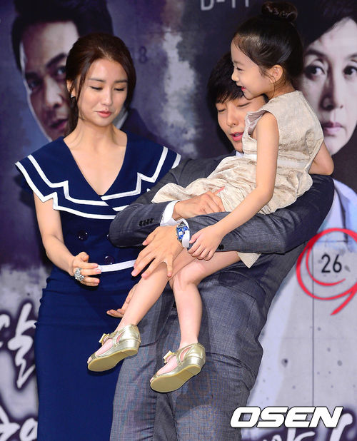 31일 오후 서울 논현동 컨벤션헤리츠에서 진행된 MBC 새 수목드라마 '투윅스'(극본 소현경 연출 손형석, 최정규) 제작발표회에서 배우 이준기가 아역배우 이채미를 안으며 치마가 올라가자 깜짝 놀라고 있다
