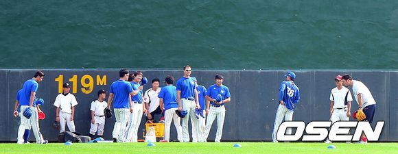 31일 오후 광주 무등야구장에서 열리는 '2013 한국야쿠르트 세븐 프로야구' KIA 타이거즈 대 삼성 라이온즈의 경기를 앞두고, 외야에서 캐치볼 훈련 중인 KIA 김진우(맨 오른쪽)가 삼성 선수단을 향해 모자를 벗어 인사하고 있다.