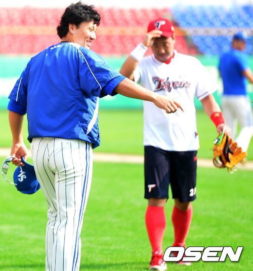 31일 오후 광주 무등야구장에서 열리는 '2013 한국야쿠르트 세븐 프로야구' KIA 타이거즈 대 삼성 라이온즈의 경기를 앞두고, 삼성 이승엽이 KIA 선수단과 인사를 나누고 있다.