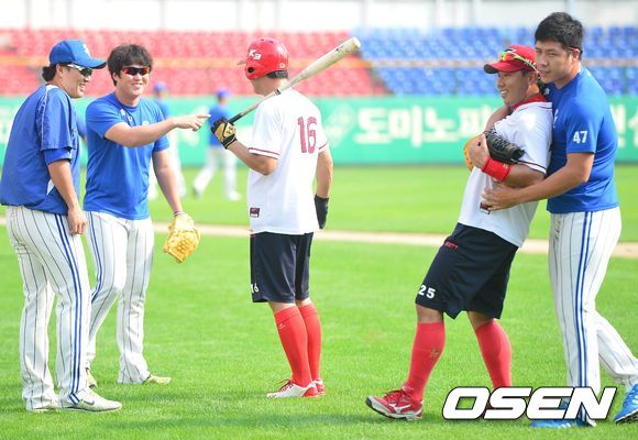 31일 오후 광주 무등야구장에서 열리는 '2013 한국야쿠르트 세븐 프로야구' KIA 타이거즈 대 삼성 라이온즈의 경기를 앞두고, 삼성 이승엽, 안지만, 권혁 등과 KIA 이범호, 김주찬이 인사를 나누고 있다.