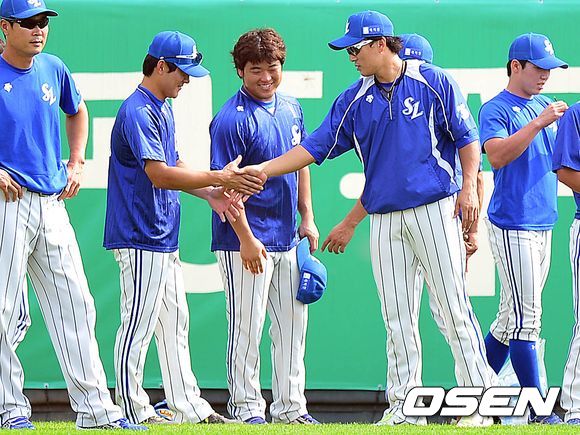 31일 오후 광주 무등야구장에서 열리는 '2013 한국야쿠르트 세븐 프로야구' KIA 타이거즈 대 삼성 라이온즈의 경기를 앞두고 삼성 이승엽과 배영섭이 악수를 나누고 있다.