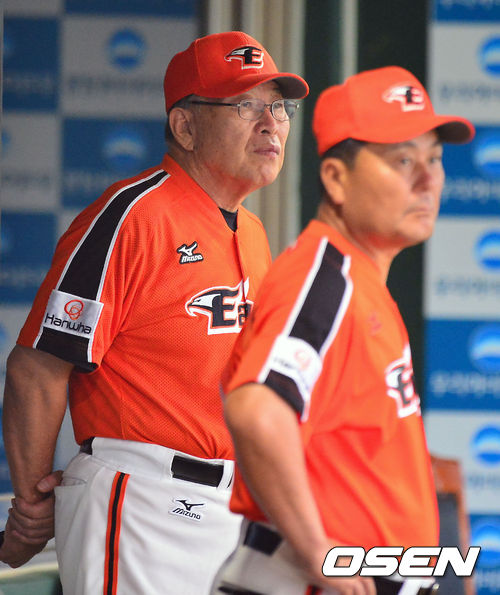 31일 오후 서울 목동구장에서 2013 한국야쿠르트 세븐프로야구 넥센 히어로즈와 한화 이글스의 경기 경기가 열릴 예정인 가운데 경기 전 한화 김응용 감독과 김성한 수석코치가 덕아웃에서 선수들의 훈련을 지켜보고 있다. 김응용 감독은 1,500 승에 단 1승 만을 남겨둔 상태로 오늘 경기에서 승리를 하면 감독 통산 1,500승을 달성하게 된다.