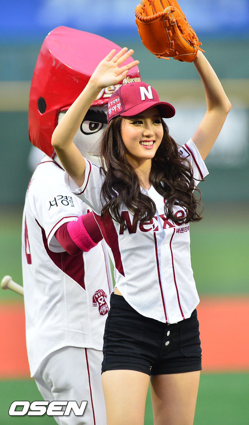 31일 오후 서울 목동구장에서 2013 한국야쿠르트 세븐프로야구 넥센 히어로즈와 한화 이글스의 경기 경기가 열릴 예정인 가운데 경기 전 타히티의 지수가 승리기원 시구를 하며 인사를 하고 있다.