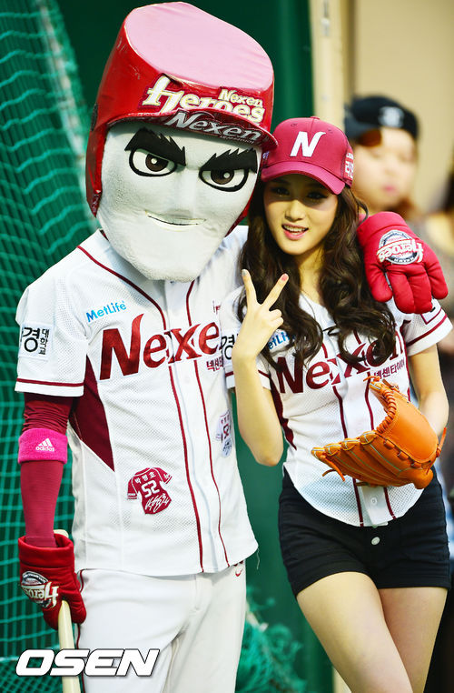 31일 오후 서울 목동구장에서 2013 한국야쿠르트 세븐프로야구 넥센 히어로즈와 한화 이글스의 경기 경기가 열릴 예정인 가운데 경기 전 타히티의 지수가 승리기원 시구 전 턱돌이와 포즈를 취하고 있다.