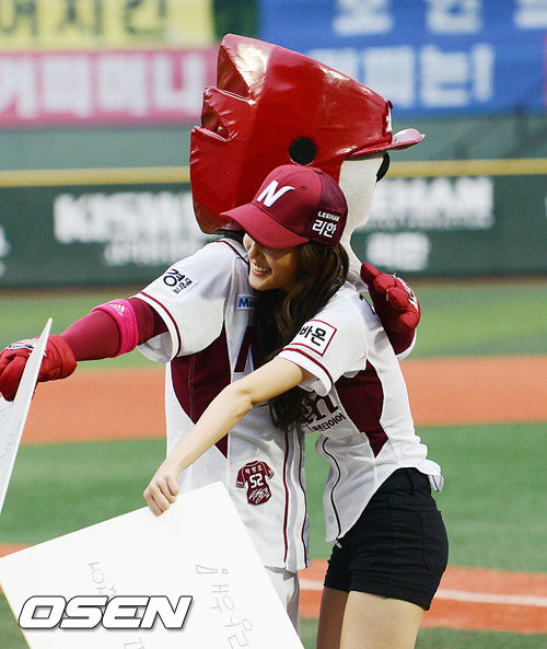 31일 오후 서울 목동구장에서 2013 한국야쿠르트 세븐프로야구 넥센 히어로즈와 한화 이글스의 경기 경기가 열릴 예정인 가운데 경기 전 타히티의 지수가 승리기원 시구를 한 후 턱돌이와 포옹을 하고 있다.