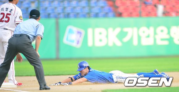 1회초 삼성 공격 선두타자로 나선 정형식이 좌중간 3루타를 날리고 세이프되고 있다.