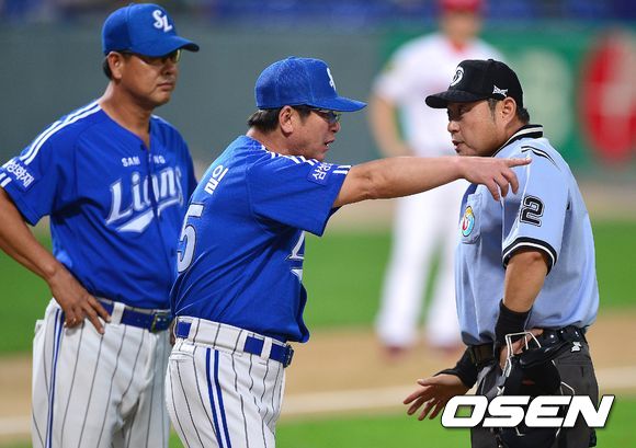 3회말 KIA 공격 무사 1, 2루 상황 신종길의 번트 때 삼성 1루수 채태인이 1루를 향해 송구하다 신종길의 어깨를 맞았다. 타자와 주자 모두 올세이프 판정을 받자 심판진에게 어필하는 삼성 류중일 감독.