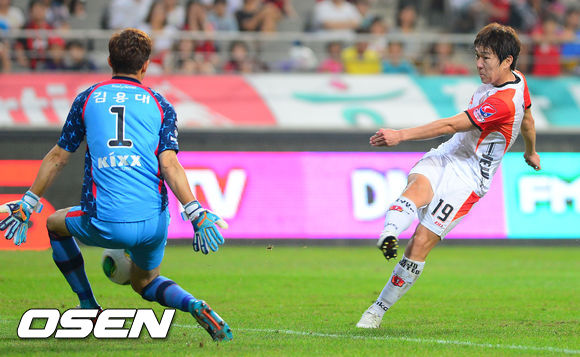 31일 오후 서울 상암동 서울월드컵경기장에서 열린 2013 K리그 클래식 FC서울과 제주 유나이티드의 경기, 전반 제주 배일환이 FC서울 김용대 골키퍼의 선방에 막혀 슛찬스를 놓치고 있다