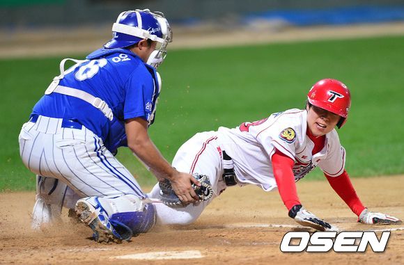 3회말 KIA 공격 1사 2, 3루 상황 안치홍의 내야 땅볼 때 홈으로 내달린 3루주자 윤완주가 포수 이지영의 태그에 걸려 아웃되고 있다.