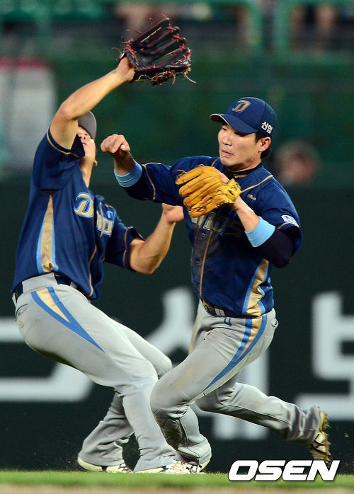 31일 오후 인천 문학구장에서 열린 '2013 한국야쿠르트 세븐 프로야구' SK 와이번스와 NC 다이노스의 경기, 5회말 1사 NC 나성범과 지석훈이 SK 박진만의 뜬공을 잡으려다 충돌하고 있다.