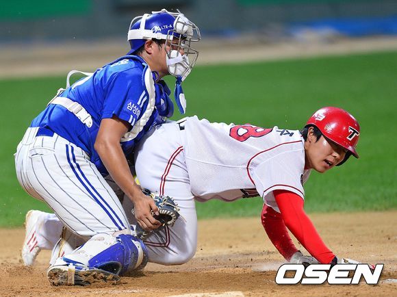 3회말 KIA 공격 1사 2, 3루 상황 안치홍의 내야 땅볼 때 홈으로 내달린 3루주자 윤완주가 포수 이지영의 태그에 걸려 아웃되고 있다.