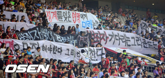 31일 오후 서울 상암동 서울월드컵경기장에서 열린 2013 K리그 클래식 FC서울과 제주 유나이티드의 경기, 전반 FC서울 서포터즈가 승부조작 징계 경감에 반대하는 플랜카드를 들고 시위를 하고 있다