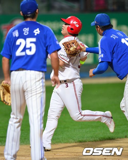 3회말 KIA 공격 2사 1, 3루 상황 8번타자 김주형의 타석 때 이중도루를 시도하던 3루주자 김선빈이 협살에 걸려 아웃되고 있다.