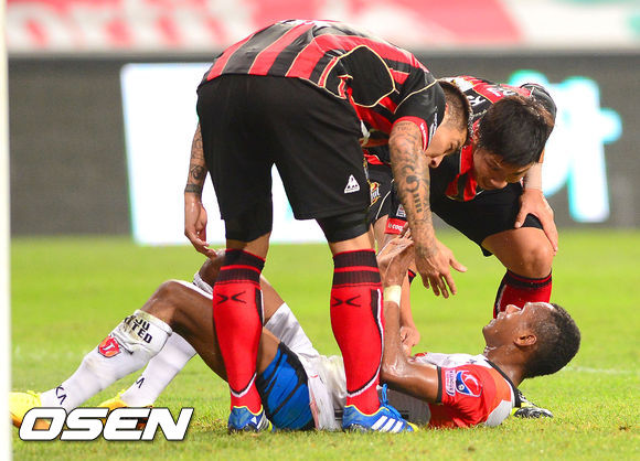 31일 오후 서울 상암동 서울월드컵경기장에서 열린 2013 K리그 클래식 FC서울과 제주 유나이티드의 경기, 전반 제주 마라냥이 FC서울 김용대에게 골키퍼 차징파울을 범하자, 차두리와 김진규가 마라냥에게 강력하게 어필하고 있다.