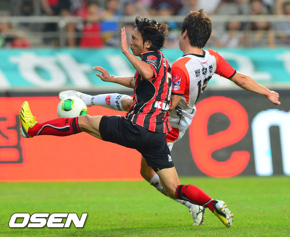 31일 오후 서울 상암동 서울월드컵경기장에서 열린 2013 K리그 클래식 FC서울과 제주 유나이티드의 경기, 전반 FC서울 김치우와 제주 배일환이 볼을 다투고 있다