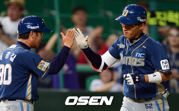31일 오후 인천 문학구장에서 열린 '2013 한국야쿠르트 세븐 프로야구' SK 와이번스와 NC 다이노스의 경기, 7회초 2사 NC 노진혁이 솔로 홈런을 때린 뒤 이광길 코치와 하이파이브를 하고 있다.