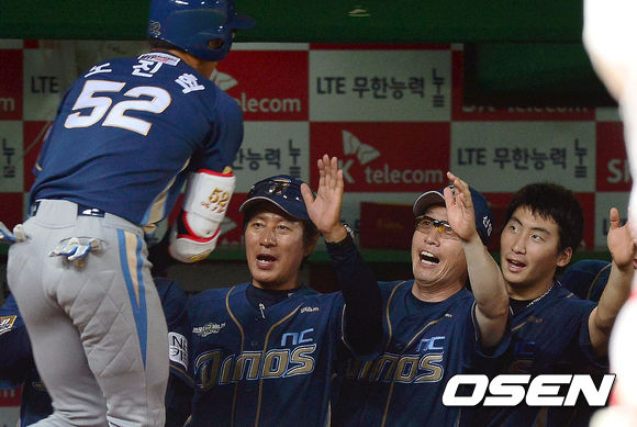 31일 오후 인천 문학구장에서 열린 '2013 한국야쿠르트 세븐 프로야구' SK 와이번스와 NC 다이노스의 경기, 7회초 2사 NC 노진혁이 솔로 홈런을 때린 뒤 코칭 스태프 및 동료들과 기뻐하고 있다.