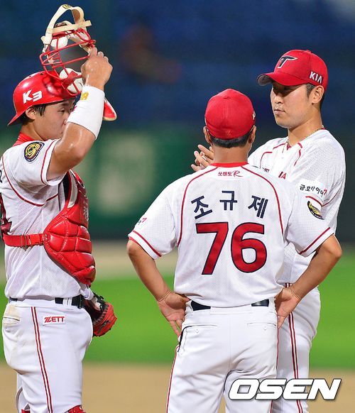 6회초 삼성 공격 무사 1, 2루 상황 KIA 선발 윤석민이 마운드에 오른 조규제 코치, 포수 이홍구와 대화를 나누고 있다.