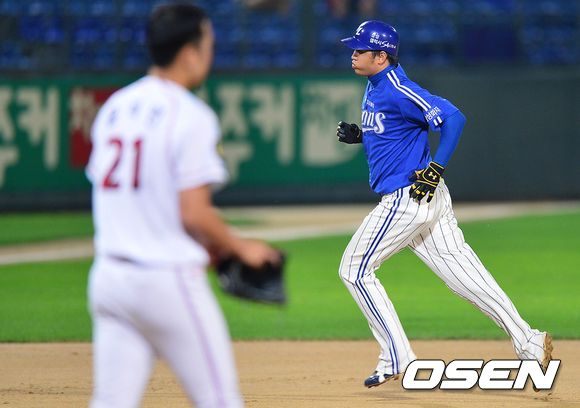 6회초 삼성 공격 무사 1, 2루 상황 5번타자 채태인이 역전 중월 스리런포를 날리고 그라운드를 돌고 있다.