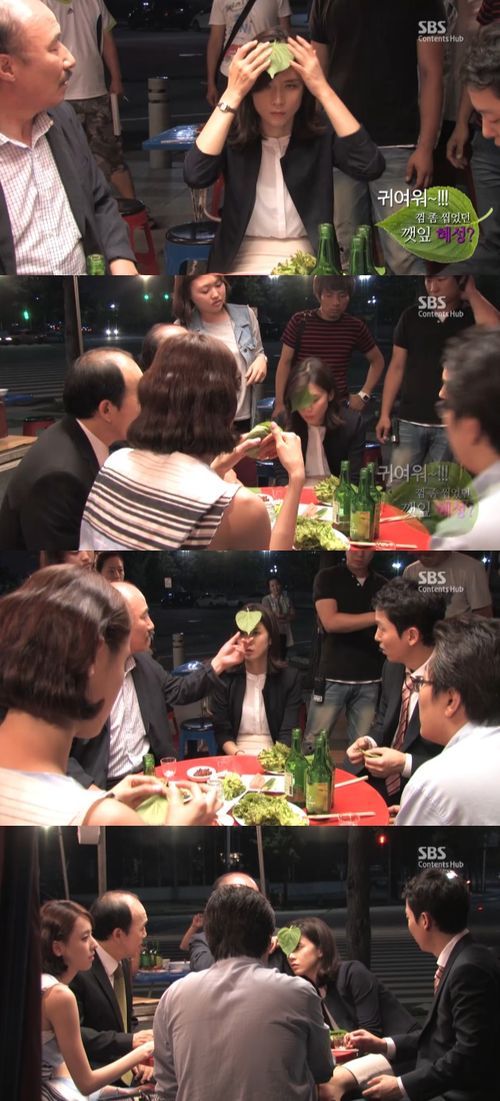 해당 영상은 장혜성(이보영 분)과 서도연(이다희 분), 김공숙(김광규 분) 판사, 신상덕(윤주상 분) 변호사 등이 함께 포장마차에서 술을 마시고 있는 장면을 담았다. 이 신은 이보영이 앞머리에 깻잎을 붙인 채 만취연기를 펼쳐 시청자들에게 웃음을 선사한 장면이다.