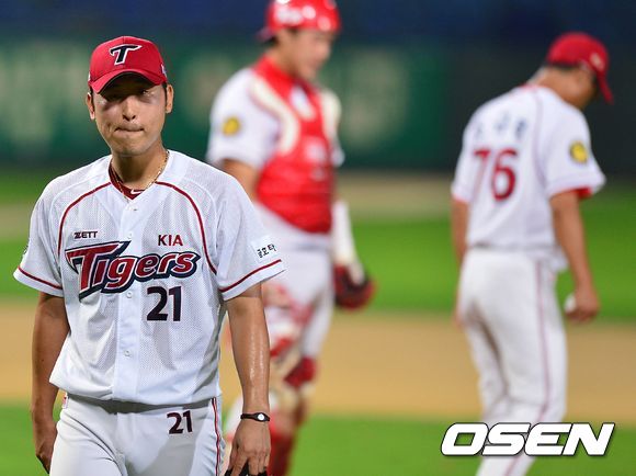 6회초 삼성 공격 무사 1, 2루 상황 5번타자 채태인에게 역전 중월 스리런포를 허용한 KIA 선발 윤석민이 마운드를 내려오며 아쉬운 표정을 짓고 있다.