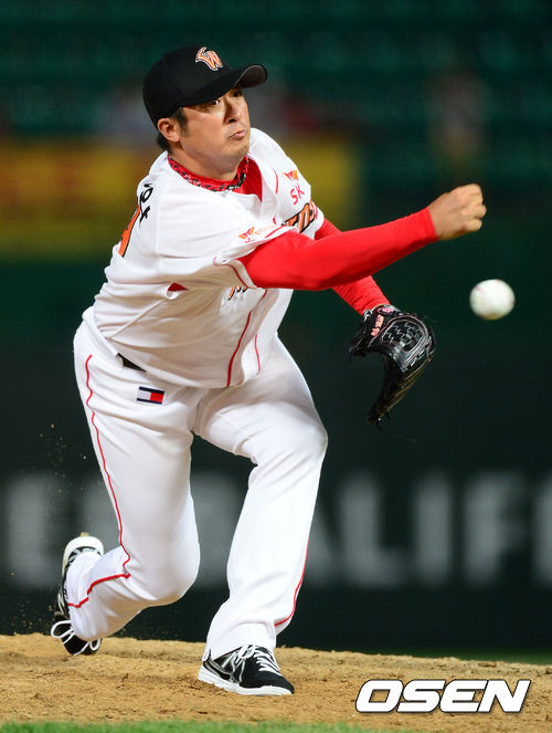31일 오후 인천 문학구장에서 열린 '2013 한국야쿠르트 세븐 프로야구' SK 와이번스와 NC 다이노스의 경기, 9회초 SK 임경완이 역투하고 있다.