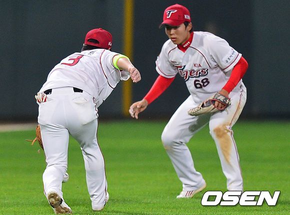 6회초 삼성 공격 2사 2, 3루 상황 3번타자 최형우의 유격수 플라이 타구를 KIA 유격수 김선빈과 좌익수 윤완주가 공을 놓치고 있다.