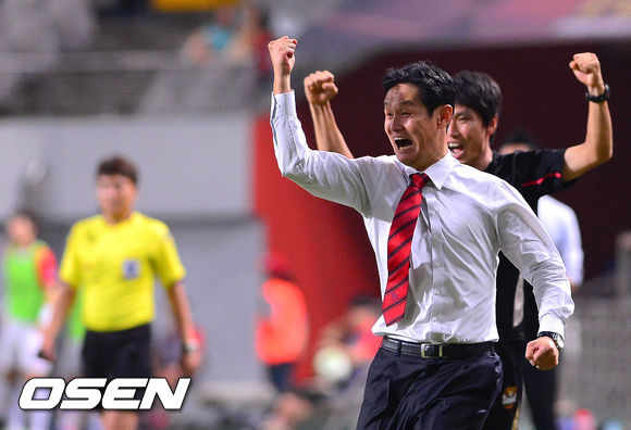 31일 오후 서울 상암동 서울월드컵경기장에서 열린 2013 K리그 클래식 FC서울과 제주 유나이티드의 경기, 후반 FC서울 아디의 선취골때 최용수 감독이 환호하고 있다.