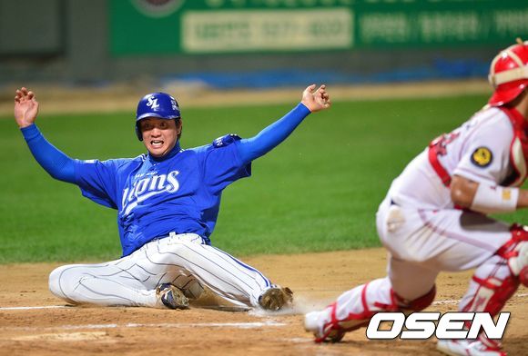 6회초 삼성 공격 2사 만루 상황, 대타 성의준의 3타점 2루타 때 1루 주자 채태인이 몸을 날려 홈에 세이프 되고 있다.