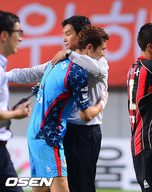 경기종료후 FC서울 최용수 감독이 종료직전 페널티킥 슈퍼세이브 펼친 김용대와 포옹을 하고 있다. / soul1014@osen.co.kr