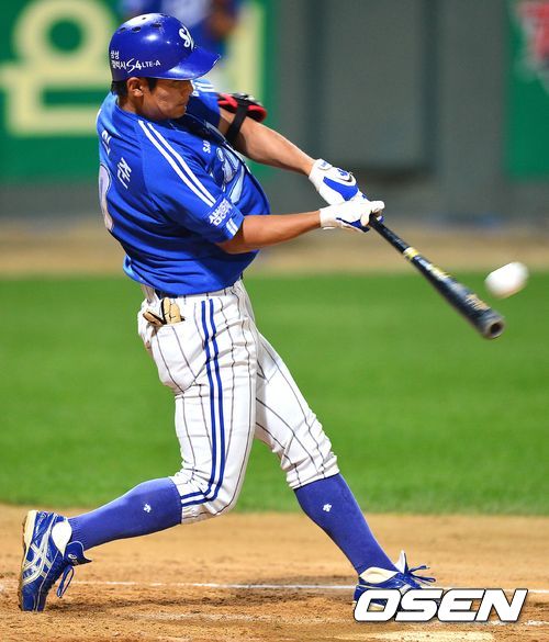 6회초 삼성 공격 2사 만루 상황 대타 성의준이 싹쓸이 3타점 2루타를 날리고 있다. 프로데뷔 첫 안타.