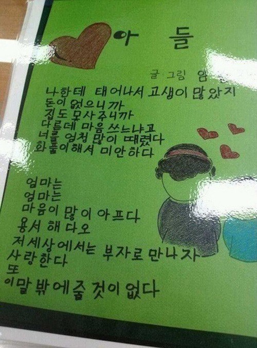 이 어머니는 시에서 "돈이 없으니까. 집도 못 사주니까. 다른 데 마음 쓰느냐고 너를 엄청 많이 때렸다. 화풀이해서 미안하다"면서 "엄마는 엄마는 마음이 많이 아프다. 용서해다오. 저 세상에서는 부자로 만나자. 사랑한다. 또 이 말밖에 줄 것이 없다"고 적었다.