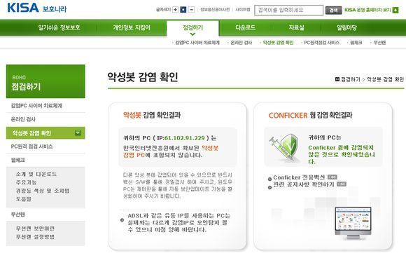 좀비PC확인법은 악성코드나 해킹툴이 감염된 일명 '좀비PC'를 자가진단할 수 있는 방법이다. 한국인터넷진흥원(KISA)에서 운영하는 보호나라(http://www.boho.or.kr/kor/check/check_03.jsp)를 방문하면 된다. 보호나라에서 악성봇 감염확인을 누르면 자동으로 확인이 가능하다.