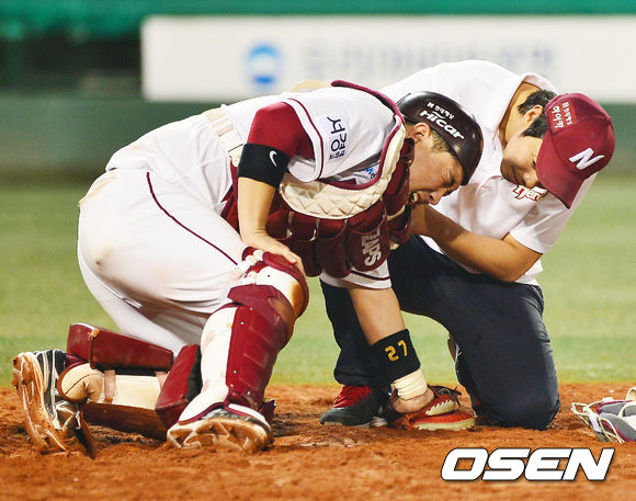 9회초 2사 주자 2루 한화 추승우의 파울타구에 맞은 넥센 허도환이 고통스러워 하고 있다./ rumi@osen.co.kr