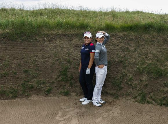 [OSEN=스포츠부] 박인비(25, KB금융그룹)와 유소연(23, 하나금융그룹)이 브리티시 오픈 공식 연습라운드 중 거대한 항아리 벙커에서 익살스런 표정을 짓고 있다.