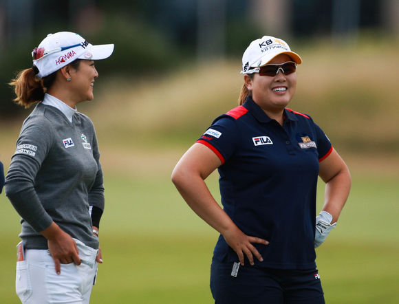 [OSEN=스포츠부] 박인비(25, KB금융그룹)와 유소연(23, 하나금융그룹)이 브리티시 오픈 공식 연습라운드 중 미소를 짓고 있다.