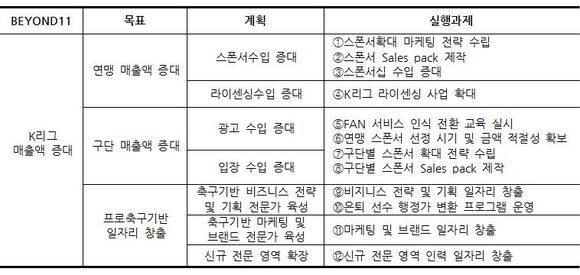 이를 통해 2022년까지 연맹은 연간 매출 600억 원, K리그 소속 전구단 총 매출액 9400억 원 등 프로축구 전체 연간 매출 규모를 1조 원까지 끌어 올리는 것이 목표다.