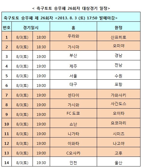 [축구토토] 국민체육진흥공단(www.kspo.or.kr)이 발행하는 체육진흥투표권 수탁사업자인 스포츠토토(www.sportstoto.co.kr)는 오는 3일에 벌어지는 K리그 클래식 5경기 및 일본프로축구(J리그) 9경기 등 총 14경기를 대상으로 한 축구토토 승무패 26회차 게임을 발행한다고 밝혔다.
